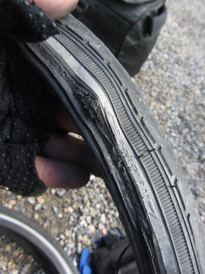 と、途中で後輪がパンク。タイヤを外してみてみると、横の部分が裂けちゃっていた。たぶん、後部搭載の荷物が重すぎて、カーブで曲がる時にかかる横の加重に耐えられなくてこんな状態になっちゃったんだと思われる。う~ん、確かに重過ぎるんだよね、今のファニーバニーに搭載している荷物。上り坂でのペダルが極端に重くなるから、山道を走っていると、荷物の重さっていうものを実感できる。どこかで減らさなきゃいけないなぁ・・・でも減らせるようなモノってないから、今の状態になっちゃっているんだよなぁ・・・