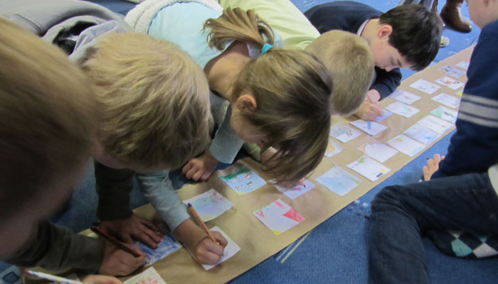 講演の最中に一人一人の将来の夢を聞いて・・・ってなことまでは出来なかったんだけど、描いてくれた絵を広げて、それをもとに話を展開させることができた。