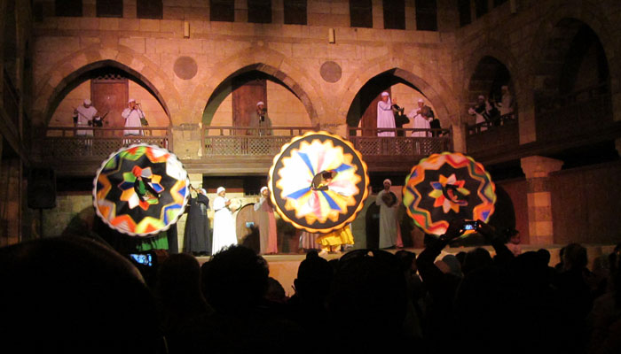 結構人だかりができている<スルタンゴーリーの隊商宿>前の野外ステージに到着。意外と人気があるらしい。と、まずは楽器を持った白装束の人たちが出てきた。この感じはイスタンブールで見たのと同じだったのだが・・・演奏し始めた音楽が、予想に反してかなりのアップテンポ。イスタンブールのスーフィーダンスは、緩やかで、非常におごそかで、そのおごそかな中でくるくる回る人たちが幻想的だったのだが・・・ここカイロのスーフィーダンスは、おごそかなんて言葉は微塵も当てはまらない。くるくる回るダンスという意味では共通点があるのだが、こちらはとにかく激しく華やか。衣装もカラフルなものが多く、見た目が派手。そう、見世物として、昇華させた感じなのだ。