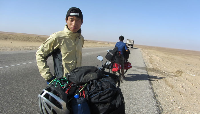 走り出したら、今日はひたすら砂漠道。延々変わらない砂漠が広がり、そこにひかれた一本のアスファルト道をただただ、走る。