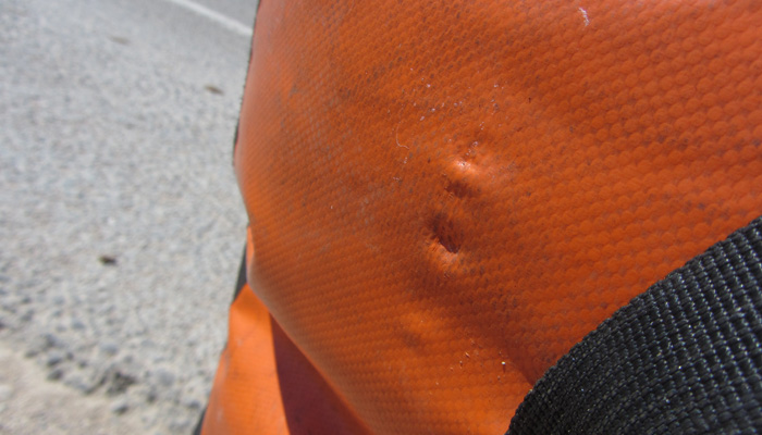 慌ててチャリを道脇に倒し置いて、バックを咥えたまま走り去ろうとする犬を追いかける。幸い、すぐに放して、バックだけ置いて遠巻きに吠えまくるその犬。バックを奪い返すことができたのだが・・・一部が壊されていた。リアキャリアとの接続部分のアタッチメントが壊れていなかったのだけが幸い。