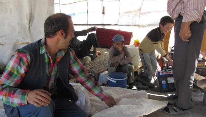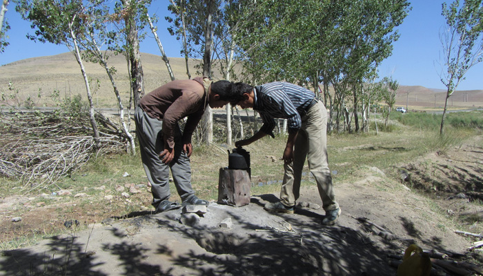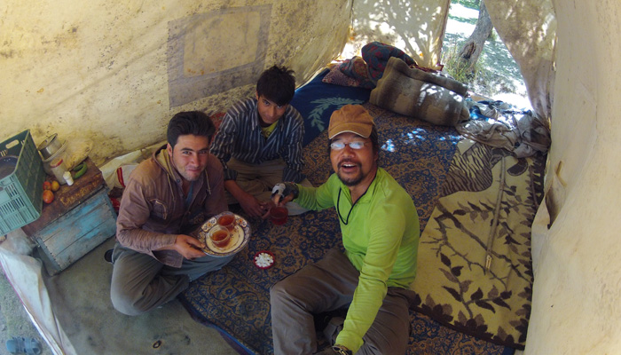 おじさんと別れ、しばらく走っていたら、「チャイ飲まないか?」と道端にいたお兄さんたちに声をかけられた。ぜひぜひ、と思って、彼らのテントに招かれる。いやぁ、心温まる瞬間だ。イランの人達は優しいと聞いてたケド、ホントだな。