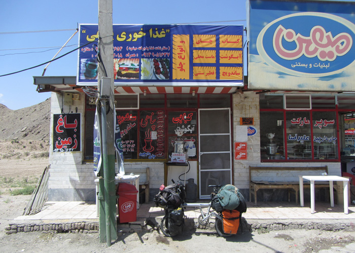 そして、お兄さんたちと別れた後、ひたすら走り続け、お昼時間になったので、食堂に入って飯。と、ここでもおじさんが話しかけてくるので、お互いつたない英語でなんとかコミュニケーション。で、食べ終わって会計しようとしたら、おじさんが「キミの分は、払っておくから」と。ふおお、いや、オイラが食べた分はオイラが払いますって、と言ったのに、おじさんは、もう払ってしまった。店のおじちゃんも、「あの人からもうお金はもらったから」と、オイラのお金は受け取ってくれない。いやはや、もうここは素直に、ご好意を受け取っておこう。ありがとうございました。それにしても、見ず知らずの旅人に・・・イランの人はこんなにも優しいんすか。