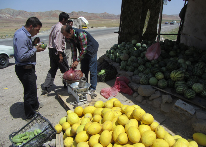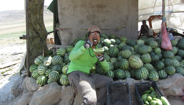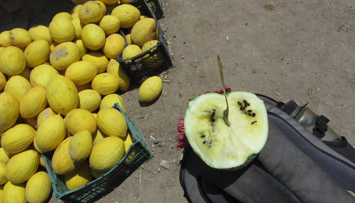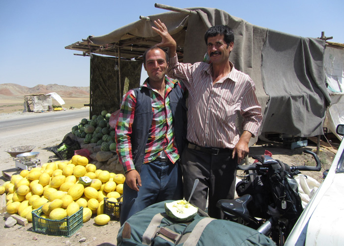 さらに、走り出して、道端にスイカ売りの人たちが居たので、見ていたら「スイカ食べるか?」と声をかけられまして。もちろん、タダでいいとのことで、イランでも、スイカを丸ごとプレゼントしていただきまして。