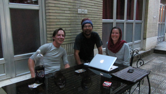 出発が遅れたせいで、夕刻遅くにイスファハン到着。と、宿に行ってみたら、アルメニアの山の中で出会ったフランス人チャリダーの二人、ヨゴス&ベルジニがいるじゃないですか。おお、こんなところで再会とは!と、偶然の再会にテンション上がりまくるオイラたち。ちなみに、ヨゴス&ベルジニのお二人は、ちゃんとチャリで走り続けてここまで来たらしい。乗り物ワープだらけのオイラとは大違い。が、逆に言うと、イランのバス旅の快適さを知らないってワケだ。それはそれで、ちょっともったいないですよ、お二人さん。
