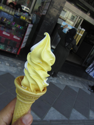 さて、この時のオイラは、まだ多重層理論を実践出来ない段階なので、単純に表層的に楽しめることが一番。花より団子な状態でして。ということで、興味はとにかく、わかりやすい、食べ物。で、イランの食べ物と言えば・・・サフラン。イランは、サフランの主生産地でして。サフランってのは、世界一高価な香辛料。イランではそんなサフランがふんだんに使われているんですわ。例えばアイス。サフランアイスがどこに行っても買える。このサフランアイスがめちゃ美味い。