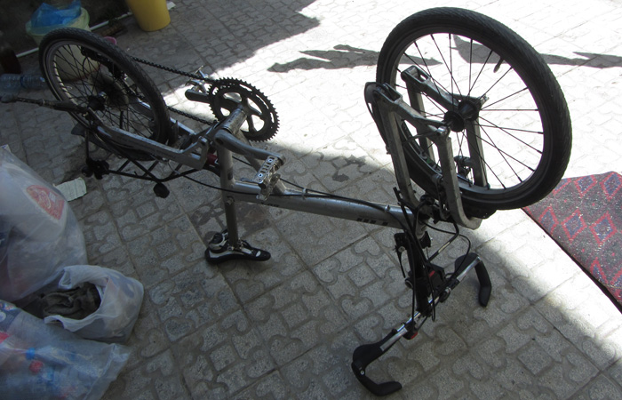 自転車屋のお兄さんによると、直せそうだけれども、すぐには無理ということで、一旦預ける。まぁ、トルクメニスタンビザ受け取りのため、どうせ待たなきゃいけないから、2日くらいは問題ない。