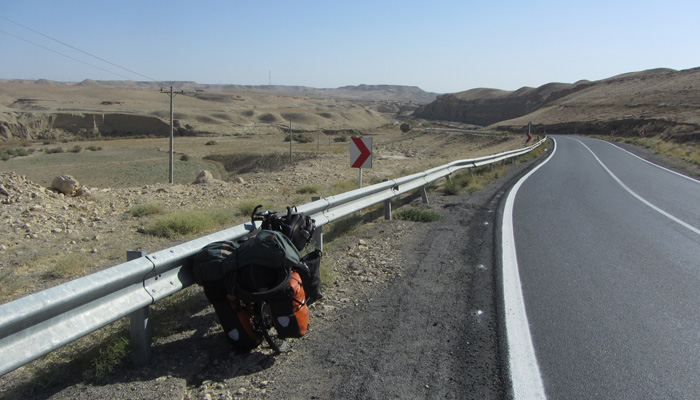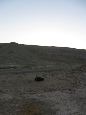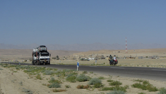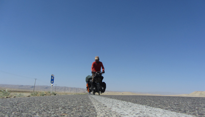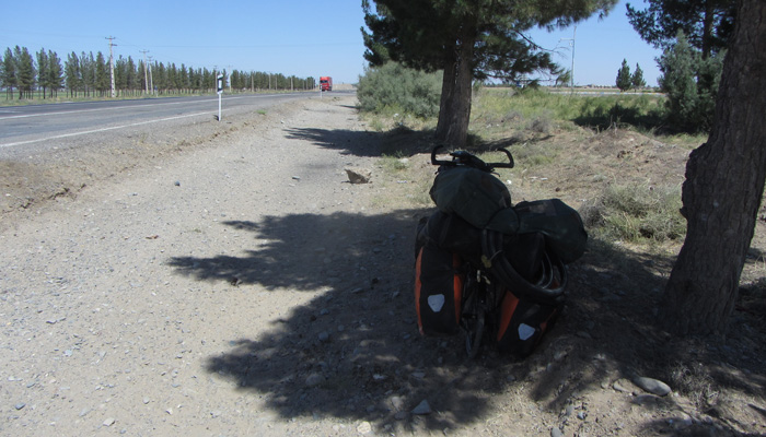テントをたたんで出発。ひたすら何もない道を走る続ける。と、向こうからチャリダーカップルがやってきた。話をしたら、ディビットとジュリアというフランス人のお二人。トルクメニスタンを走ってきて、国境の町で、数日休んで、今朝、走り始めたらしい。国境の町は、ちょっと怪しいから気をつけて、とアドバイスされた。確かに、ギリシャのアテネで出会ったヤヨイさんも、この国境付近でヤバい目にあったらしいから、気をつけなきゃな、と思ってたんですよ。