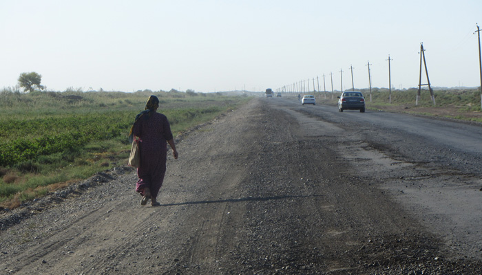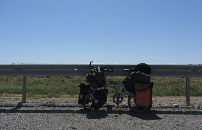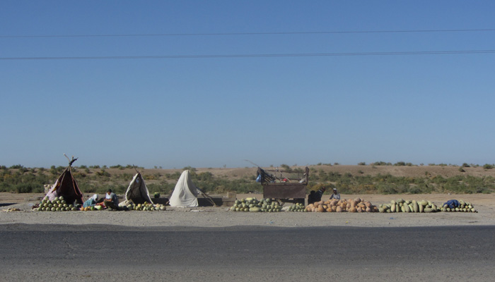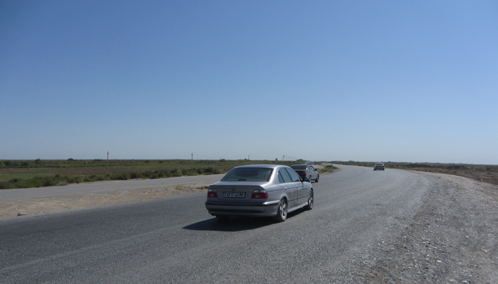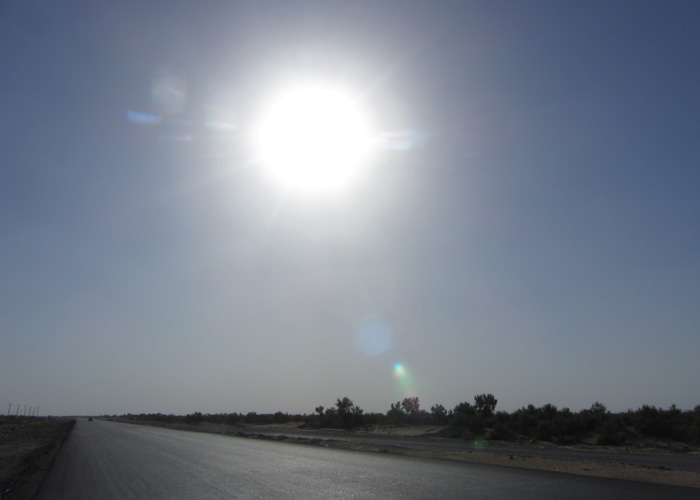 暑い中、ばててきた。しかも、ガス入り水はあまり飲みたくないので、喉もカラカラ。これはダメだ。でも、頑張って前に進まねば、トルクメニスタンを5日で抜けられない・・・普段だったら、暑い時間は日陰で休んでしまうのに、ここではそうもいかないのがキツイ。