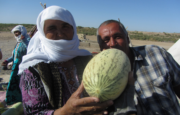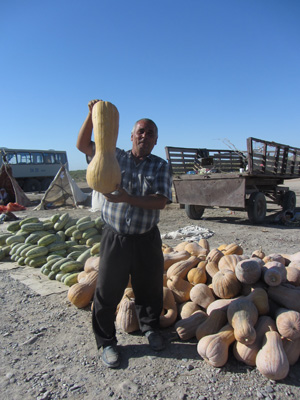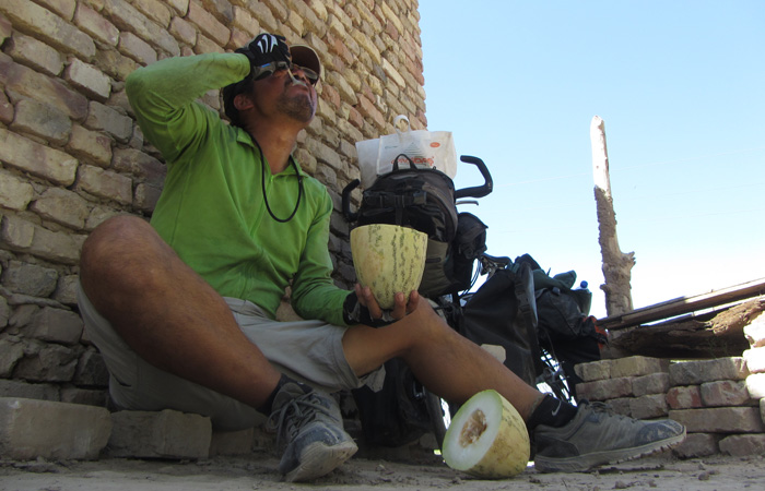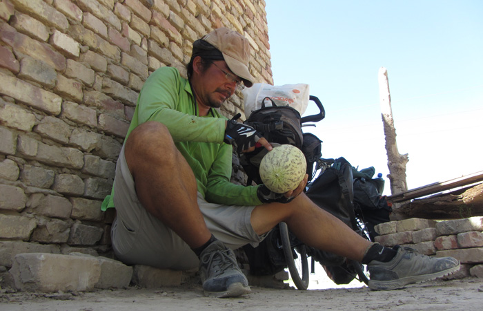 さらに、そのレストランの道路挟んで反対側で、野菜売りの露商のおじさんおばさんたちがいまして。食事を終え、走り出そうとしたら、デッカイカボチャみたいなのを片手に手招きしてきた。行ってみたら、写真を撮れ撮れと。で、写真を撮って戯れていたら、最後に、スイカを一個まるごとくれた。いやぁ、これはデカすぎる。嬉しいけれども。