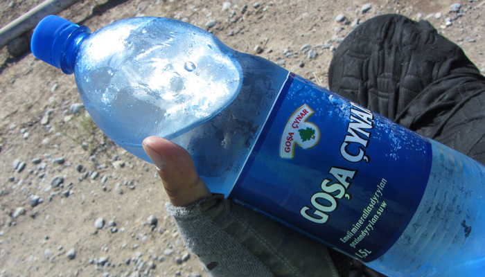 さて、ところどころにある村に寄りながら進むのだが、昼間は猛烈に暑い。なので、冷たい水が欲しくて、店で買ったのだが・・・これがなんとガス入り水。トルクメニスタンではガス入りが普通なので、ガス抜き水は、わざわざ言わないと出てこないのだ。普通に「水下さい」といったら、ガス入りを渡される。ガス入り水、冷たいうちはいいんだけど、あったまるととても飲めたもんじゃなくなるから、チャリ旅には向いてないんすよねぇ。
