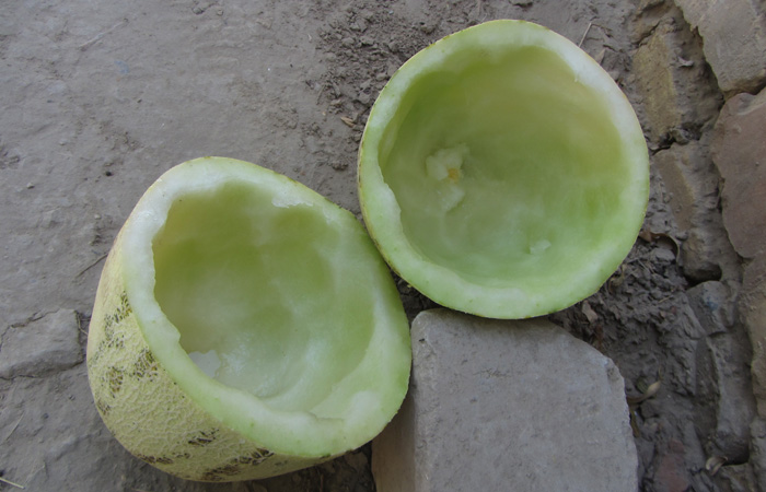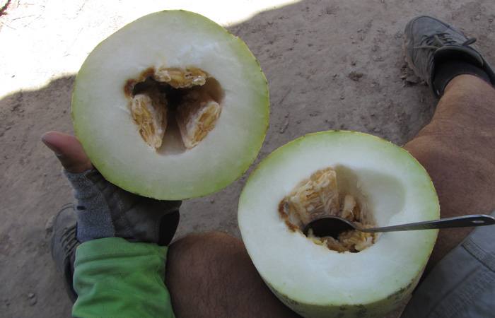 さて、途中陰になるところで休憩して、先ほどもらったスイカを食べることにしたら・・・切ってみたらなんかメロンっぽい。っていうかメロンだった。めっちゃ美味い~。