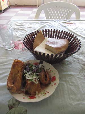 と、ふらふらしながら自転車をこいでいたら、目の前に村が見えてきた。そしてその村には、なにやら、よさげなレストランがあるじゃないですか。早速入って、チキンをオーダー。そして冷たいコカ・コーラ。くぅー生き返るぜ。
