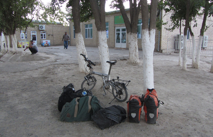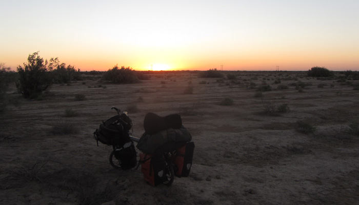 朝、夜明け前に起きる。ビザの関係で、5日間で抜けねばならないトルクメニスタン。なので、できるだけ走る時間を長くとる必要がある。しかも、昨日タイヤ捜索のために、余計な行程を入れちゃったりしたもんだから、ひょっとしたら間に合わないかも、というギリギリの状態に追い込まれちゃったし。