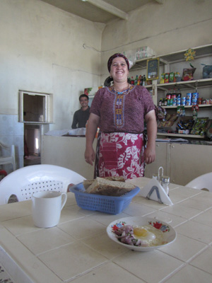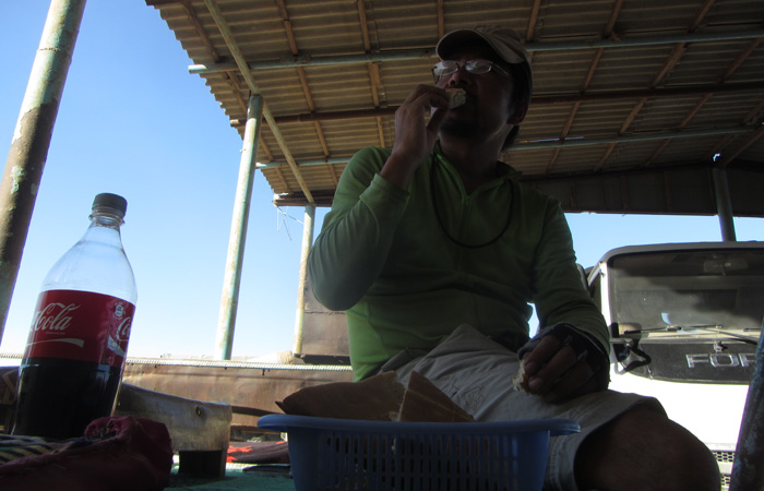 さて、しばらく走っていたら、家が見えてきた。村だ。ホント、村々がポツリポツリとしかない。昨日走ってきても村は2つくらいしかなかったもんな。で、この村で朝食をとることに。村の皆さんが集まっているところへ行くと、そこはレストランっぽかったので、入って、なにか食べ物をとジェスチャー。すると、パンと目玉焼きが出てきた。質素な食事だが、自炊はラーメンばかりだからね。これでも十分ありがたい。で、このレストランのおばちゃんが結構ひょうきんで。言葉は通じないながらも、ニコニコやりとり。そして・・・パンをほおばって食べていたら、外のおじさんたちが、こっちにまざれ、と、さかんに言ってくるので、皆さんにまじって食べることに。いやはや、みなさんフレンドリーだ。