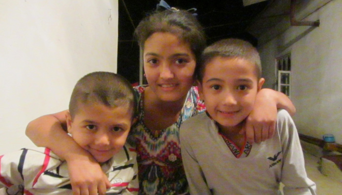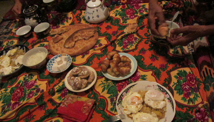 で、寝床だけでもありがたいのだが、夕飯をご馳走していただくことになりまして。外に置いてあった大きなベッドみたいな台座が、食卓とのことで、そこに料理が並べられて、夕食タイム。いやはやホント、ありがたい。さてさて、そんな食卓。食後は、15歳の少女ショヒダちゃんから、ウズベキスタン語とロシア語を習う。トゥフンが卵で、キャルトシカが芋か・・・って食べ物の単語ばかり(笑)いやいや、それよりまず習うべき単語があるだろう。感謝の言葉<ありがとう>だ。ウズベキスタン語で「ラフマット」と言うらしい。