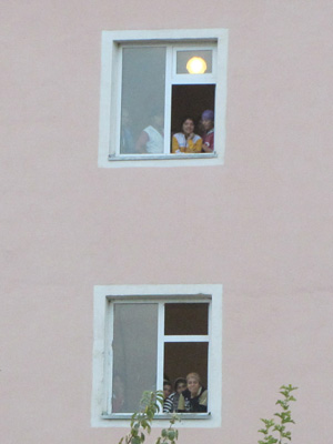 朝、起きたら、寮の建物から見られてた。で、オイラたちが起きたことが分かると、みんながゾロゾロ出てきた。なので、記念撮影。