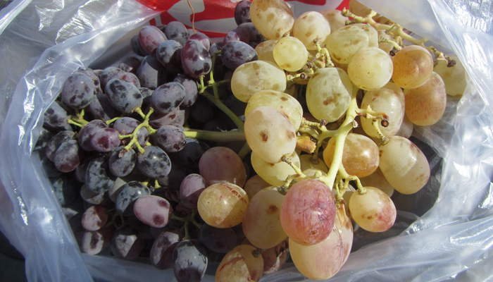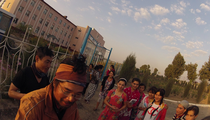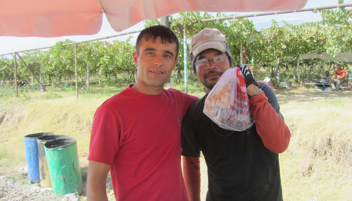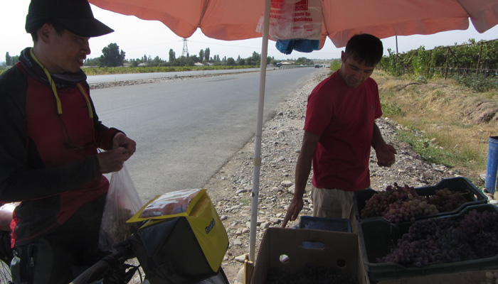 しかし、タジキスタンに入ったら、ちょっと人の感じが変わったかも。ウズベキスタンほどフレンドリーではない気がするのだ。なんて思っていたら、道脇のお兄さんが手招きしてオイラたちを呼び止めた。行ってみると、採れたてのブドウをプレゼントしてくれるっていうじゃないですか。おお、タジキスタンの人たちもやっぱり親切だ。