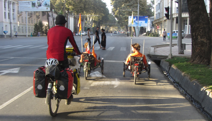 が、まぁ、そこはなんとかなってしまうのが、旅のいいところ。二人してドゥシャンベの町をチャリでウロウロ走っていたら、リカンデントチャリに乗ったフランス人カップルが現れまして。「ウォームシャワーのベローニクさん宅を探しているの?俺たちそこに泊まっているから、連れて行ってあげるよ」と言ってくれるじゃないですか。彼らに先導され、無事到着。しばらく、お世話になります。