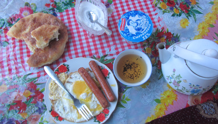 テントをたたんで走り出す。すぐ先に、食堂があったので、朝飯。いつもと同じ、目玉焼きとソーセージとカチカチのパン。今日は贅沢にヨーグルト付。