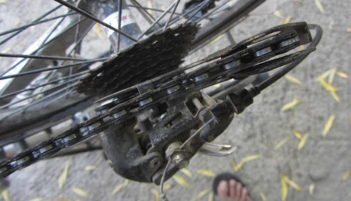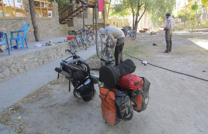 さてさて、実は、タイヤ以外にも、相棒は不安材料を抱えている。リアディレイラーがだいぶやられちゃってまして。小径車のため、地面ギリギリの位置にリアディレイラーがくるBD-1の構造。普通の道なら問題ないのだが、岩がゴツゴツむき出しになっているような道だと、リアディレイラーがぶつかっちゃうんですわ。タジキスタン道では、なんどもぶつけてしまったため、曲がってしまった。そのため、ギアチェンジがうまくいかなくなり、只今、走行は、3つくらいのギアしか使えていない。これをなんとか調整しようと思ったのだが、こういう繊細な部分は、自力では無理。おそらく自転車屋に持って行っても、「交換しないとダメですね」と言われそうな状況。まぁ、しょうがない、とりあえずは走れるからな。なんとか誤魔化しつつ前へ進もう。