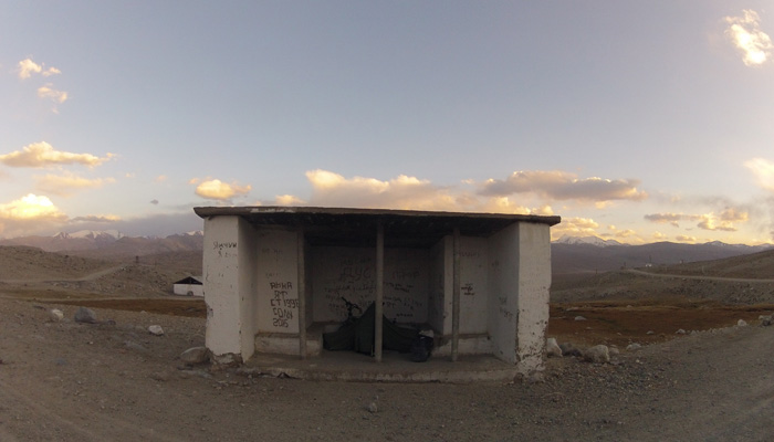 ちなみに、今日野宿したのは、検問チェックポイント近くにある、バス停みたいな建物だった。この辺には警備隊らしき人たちが常駐しているらしく、人が作った建物がいくつかあった。いやぁ、こういう風よけの建物があってありがたい。夜とにかく寒くなるので、少しでも風を防げる場所で野宿をしなくちゃ、体が悲鳴をあげる。
