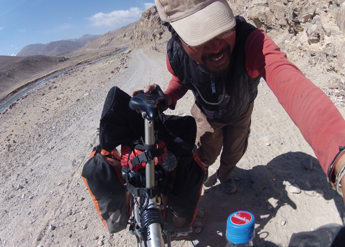I run on Tajikistan road by bicycle.