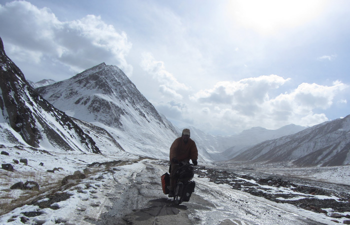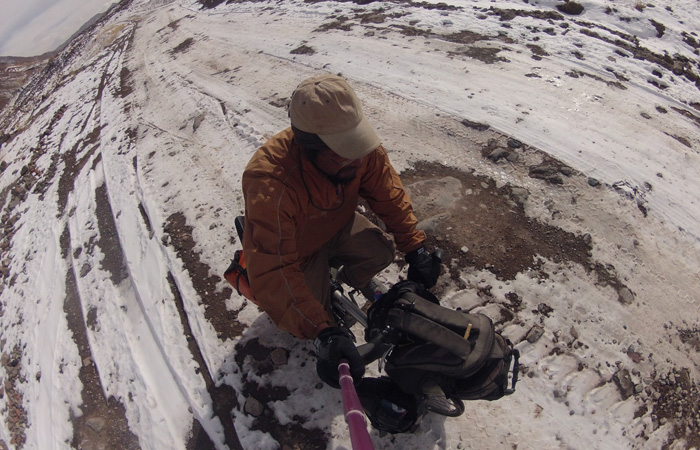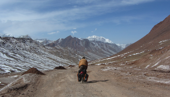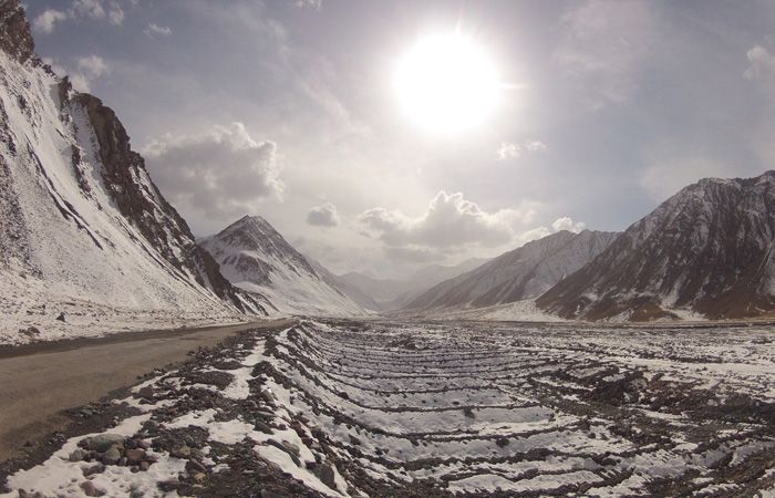 これまでは寒い寒いとは思っていたが、道が凍り付いているようなことはなかった。が、タジキスタンイミグレの後、峠を越えたら、その先は、見事に白世界となっていたのだ。こりゃ、寒いはずだよ・・・
