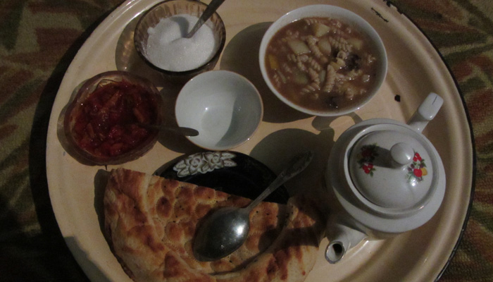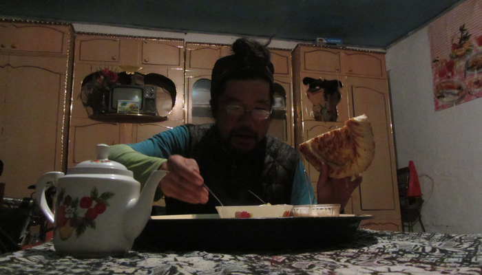 ここから先は、ほんとボーナスステージ。緩やかな下り坂が続き、あっという間に、サリタシュという村に到着した。道脇にゲストハウスと書かれたカフェがあったので、そこに泊まらせてもらうことに。暖かいラグマン(パスタラグマン)に焼きたてのパン。あ~、極楽極楽。地獄から生還できたぜ。