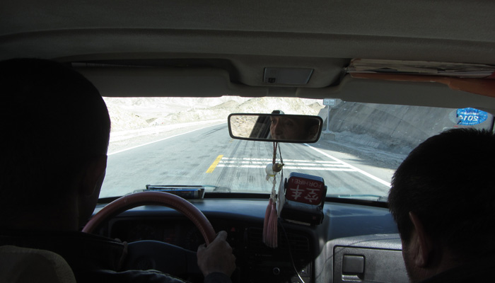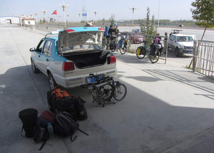 オイラたちのあとも、欧米人の老夫婦チャリダーが来て、結構チャリダーが増えた。最初はトラックの荷台にチャリを積んでもらっていたのだが、老夫婦チャリダーの大きなチャリがタクシーに乗らないということで、老夫婦チャリダーのチャリをトラックの荷台に乗せることになり、コンパクトになるオイラのチャリは、タクシーに乗せて行くことに。中国人のおじちゃんたちとタクシー相乗りして、旅行者が自由行動してよいポイントまで移動。