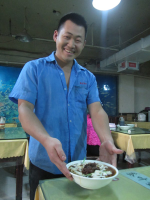まずは、屋台街なるところへ行って、包子と一人用鍋を食べる。包子は美味すぎ。しかも安い。こんなの毎日食えるなんて、中国人、なんて幸せ者なんだ~。あ~、羨ましすぎる。で、鍋、これが、ところてんみたいなもので作った透明な麺が入っていて、肉団子など具だくさん。が、意外と味がさっぱりしていて、朝にはちょうどいいかもっていうもので。ただちょっと味がさっぱりしすぎているので、美味しいかと言われると、ちと微妙。まぁ、ここではめっちゃ美味い包子が食えたから大満足。これは、この包子を食うためだけでもいいから毎日通いたい。