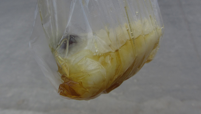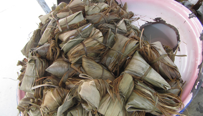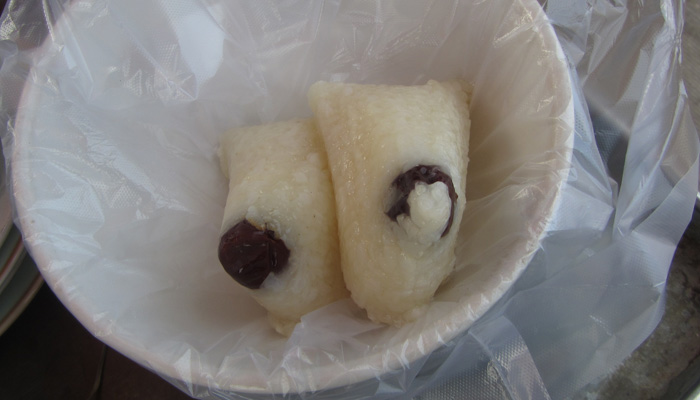 その後、屋台で、チマキっぽいものを見つけたので食べてみた。ドライフルーツが埋め込まれたチマキだったのだが、面白いのが、これを蜜につけて食べる食べ方。おじちゃんがチマキの皮から中を取り出して、ビニール袋に入れ、そこに蜜を注ぎ込んでくれる。これ、美味い。