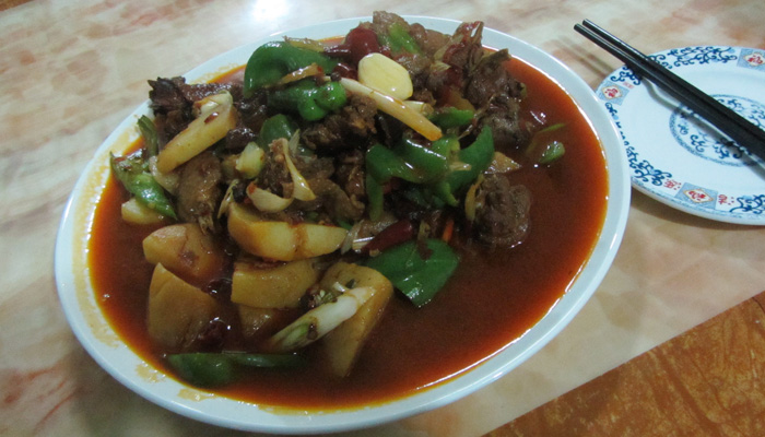 さて、夜は、大なんとか鶏という大皿料理に挑戦。普通は何人かでシェアしてつつきながら食べるものらしい。たしかに量が多すぎた。しかも、めっちゃ辛い。ひーひー言いながらも、まぁ、なんとか完食。