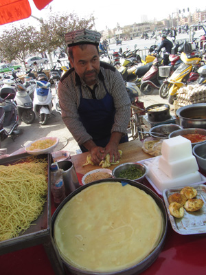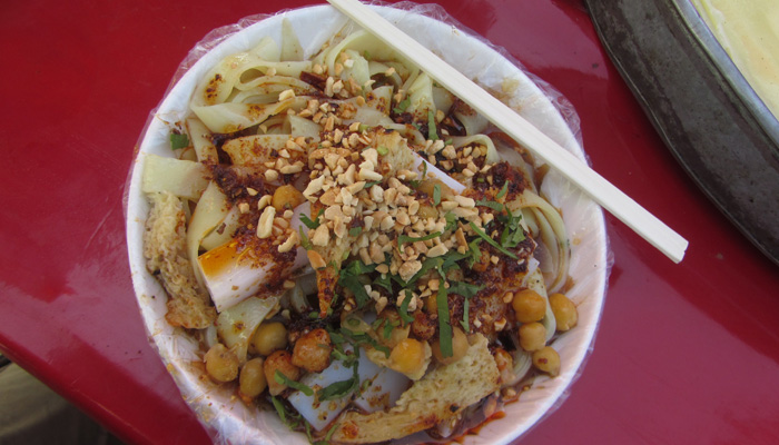 朝は、お気に入りの屋台街の店で包子と鍋。ここの包子はジンさんも絶賛。その後、マーケットへ。マーケットに向かう途中に、なにやら地元の人が群がって食べている屋台があったので、覗いてみた。クレープ状にして焼いたものを包丁で切り、麺にして食べる。ほおお、これはなんだか面白いと思って、食べてみることに。味は卵麺みたいな感じ。美味いかと言われると、超絶美味いってほどのものではないのだが、まぁ、お腹を満たすために食べるにはいい食べ物。