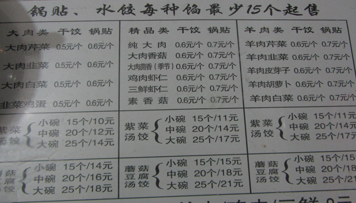 ちなみに、中国の水餃子屋はメニューが面白い。食材と調理法がマトリックス表記されている。