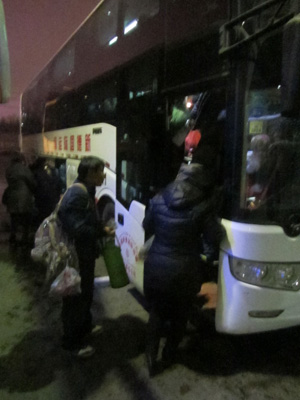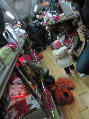 夕刻、暗くなってからバスに乗り込み、ウルムチを離れる。再びバスでの長旅。車内は満席で、人がいっぱいだったのだが、リクライニング座席がしっかりしていて、結構居心地いい中国の寝台バス。う~ん、ぐっすり眠れたよ。