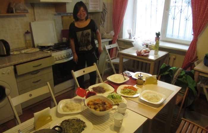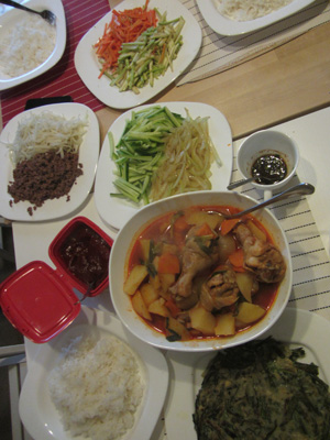 今日もアルマティ。さて、昨日の鍋パーティで「リュウさん、料理しないでしょ」と伊藤くんがツッコミ、リュウさんが「失礼な。料理くらいできるわよ」という掛け合い漫才が起こりまして。仲がいいな、キミたちは。まぁ、そんなやりとりから、リュウさんが韓国料理を作ってくれるという流れになりまして。ということで、今日の昼は、リュウさんお手製の、ビビンバとチキンの煮物という豪華韓国料理を食べれることに。