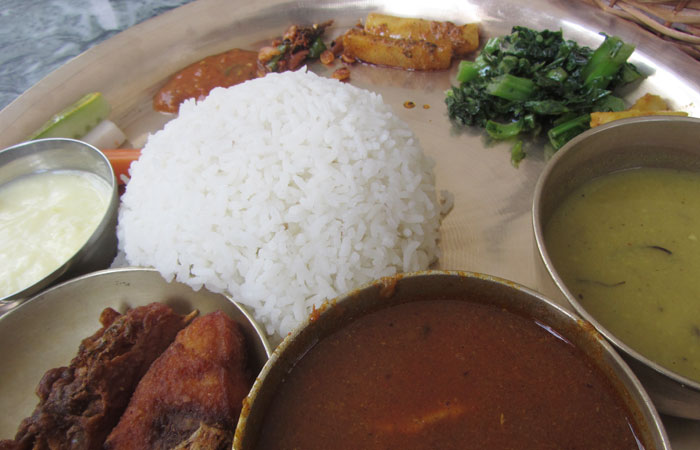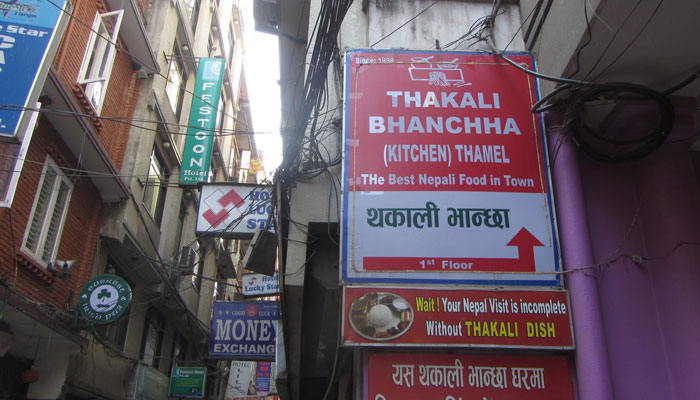 さて、タメル地区のダルバートが美味いと評判の店に行って、早速スペシャルダルバートを食べてみた。う、美味い!いやぁ、これもヤバいくらい美味いじゃないですか。ダルとは豆、バートとはご飯、つまり、豆スープが主食となるご飯定食ってことなのですよ。豆が主食?ええ、ネパールやインドでは、タンパク質を豆から摂ることが多いらしく、豆料理が主役として出てくるのです。日本で言うと味噌汁が主役みたいな感じ?スペシャルにすると揚げ魚とかその他いろいろ副菜がついてきて、食べごたえあるものになる。