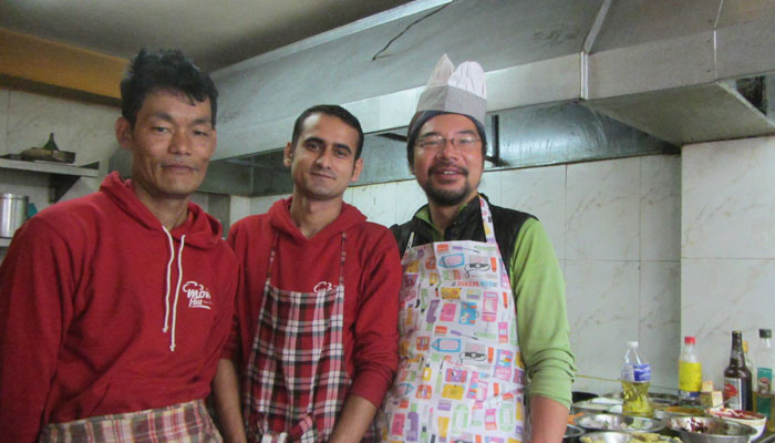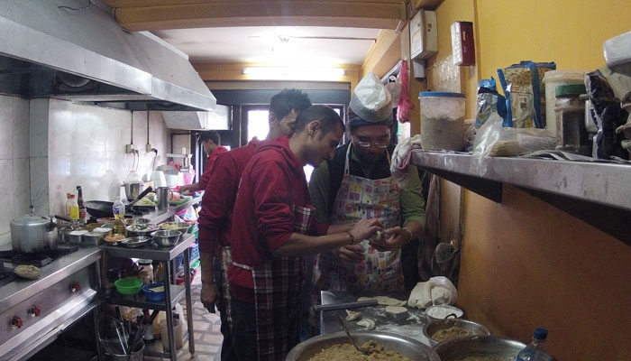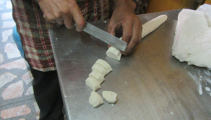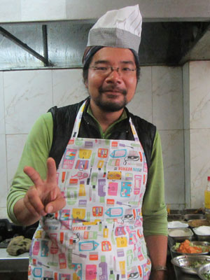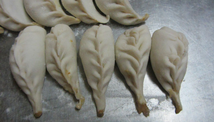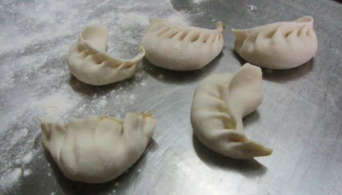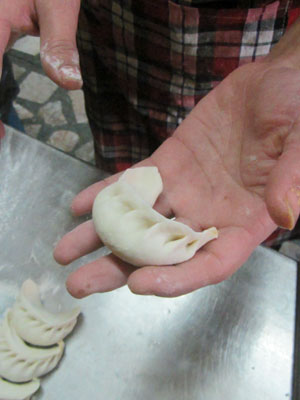 そして、皮つくり。中に入れる食材が複数種類あるため、どれに何が入っているか分からなくならないように、中に入れる具材によって、形を変えている。それぞれのカタチの包み方について、教わる。これこれ、これはぜひ習いたかったんですよ。で、これは習った後、「やってみ」と言われ、オイラも実践してみることに。いつもやっている包み方なら慣れたもんで、すぐ綺麗なカタチに出来たのだが・・・今回新しく習ったカタチはなかなか綺麗にできない。「3か月、毎日やれば、上手くなるよ」と言われた。うん、まぁ、それくらいの修行は必要ですな。