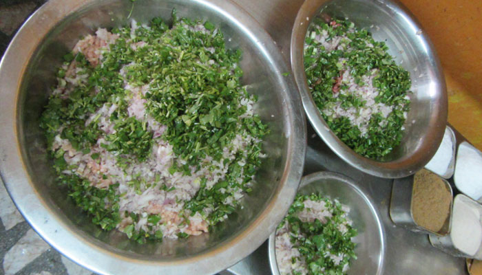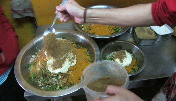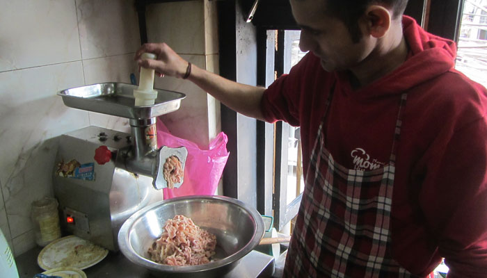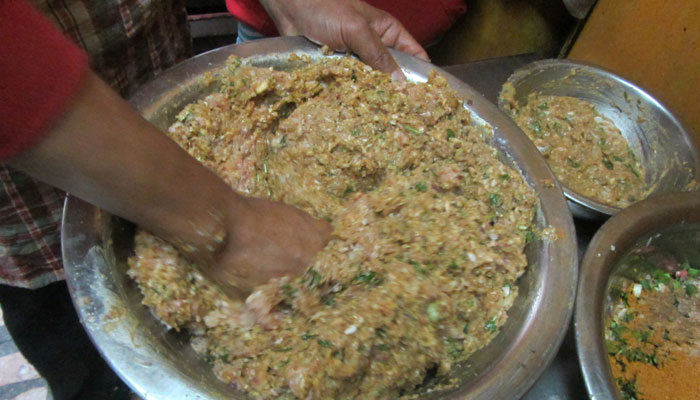 仕込みは、タネを作るための食材のカットから始まった。それを練り機に入れミンチにした後、スパイスを混ぜる。なるほど、こういうスパイスが入っているんすな。