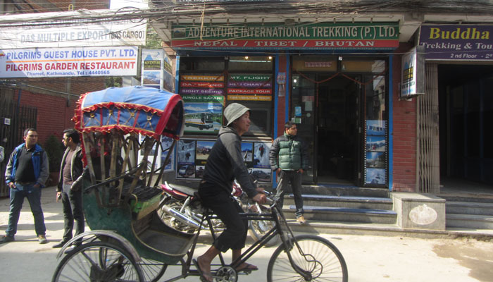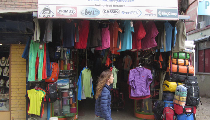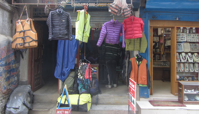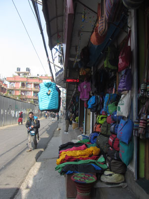 カトマンドゥの町は、そんな<にわかトレッカー>たちに優しい町でして。そこいら中に、アウトドアショップが立ち並んでいる。そんなアウトドアショップには、ニューファイスのロゴが入っているものばかりが並んでいるのだが・・・これ、ニセモノらしい。ネパールの工場で勝手にニューフェースのパクリロゴを縫い込んで出荷しているらしいのだ。そんな中に、ポツンと本物のニューフェースの店がある。賑わっているのは、周囲のニセモノが並んでいるアウトドアショップ。ちょっとシュールだ。