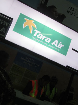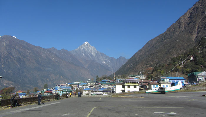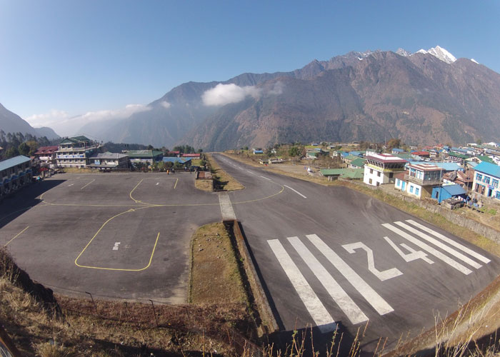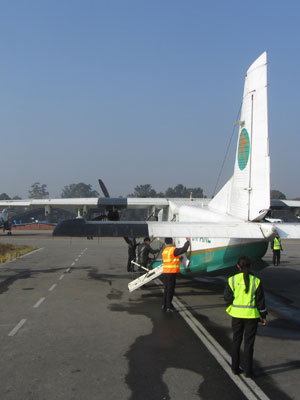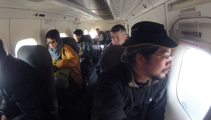 オイラの飛行機と、みなさんの飛行機は、チケット表記的には違うものだったのだが、コードシェア便らしく、乗る飛行機は皆同じに。で、荷物チェックは済ませ、いざ乗り込もうとしたら・・・チェックインできず。なんと、着陸先に濃霧が発生しているため、出発を見合わせているとのこと。こっちの天気は快晴なのに・・・実は、到着先のルクラ空港は、世界一危険な空港と言われているところなのだ。山あいに無理やり作った空港で、滑走路は短いし、濃霧がよく発生するため視界が悪い。なので、よく飛行機が山に追突するといった事故が起きているらしい。