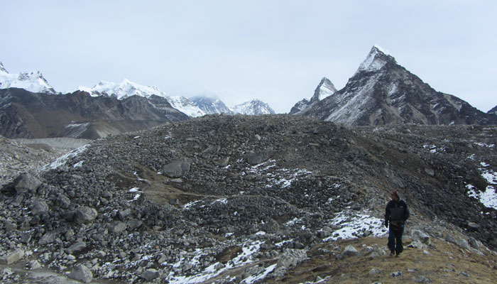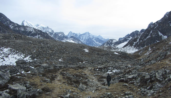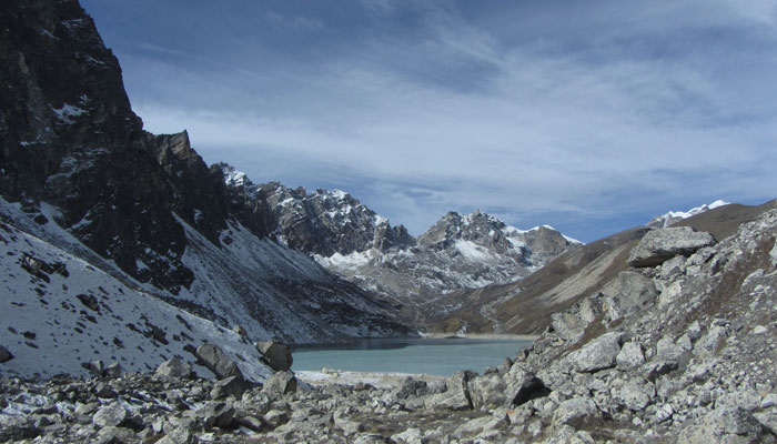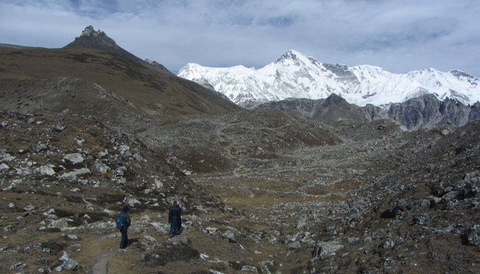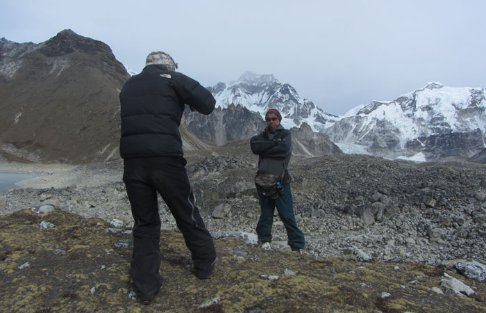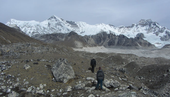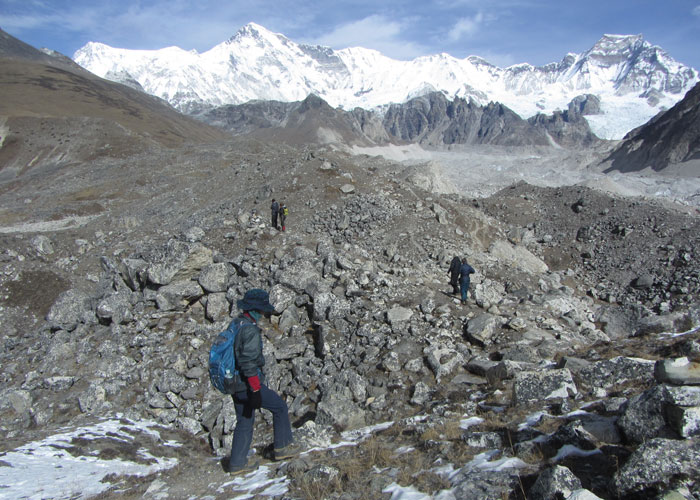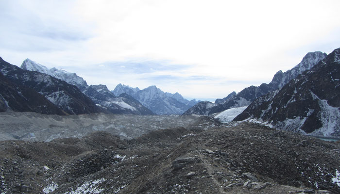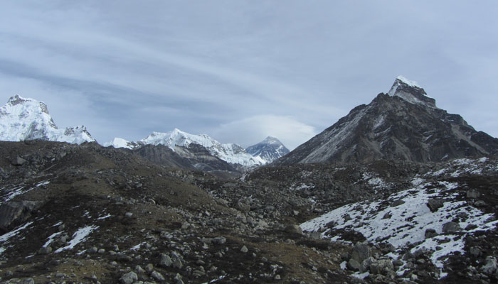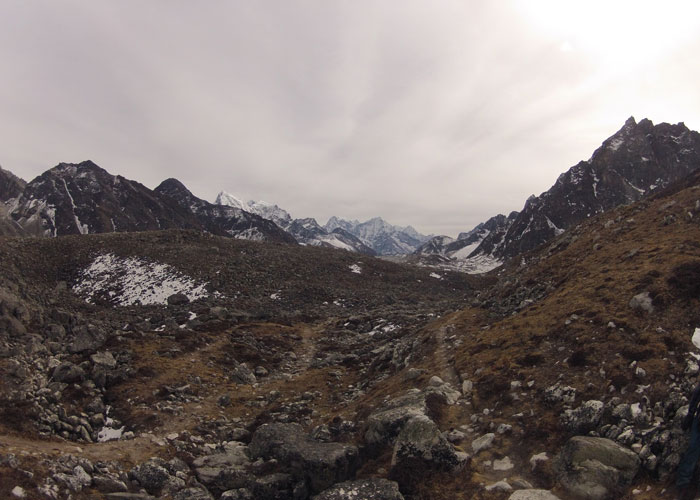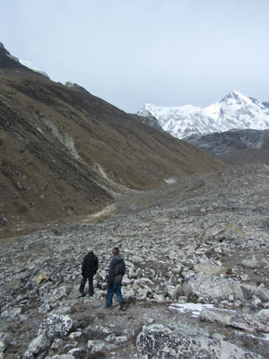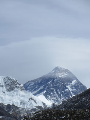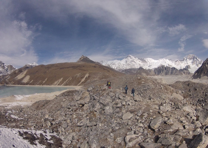さて、今日は、ゴーキョの宿に荷物を置いて、ゴーキョのさらに奥にあるチョー・オユー方面を探索することになったのだが・・・昨日のゴーキョピークを登頂した時点が、気持ち的にもまさにピークだったので、今日はなんだか気持ちが乗らない。しかも、これまでは雲一つない快晴の青空ばかりだったのに、今日は空に微妙な雲がかかってしまっている。