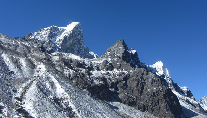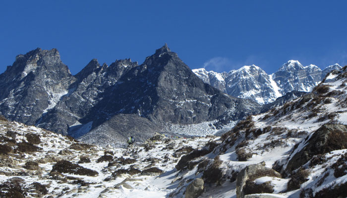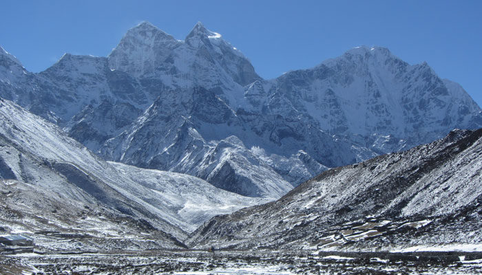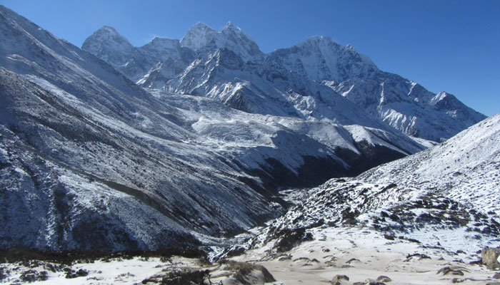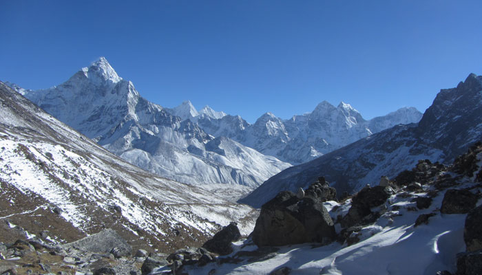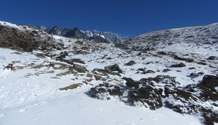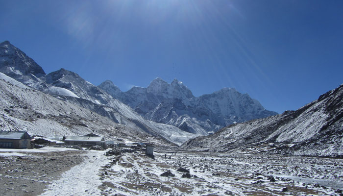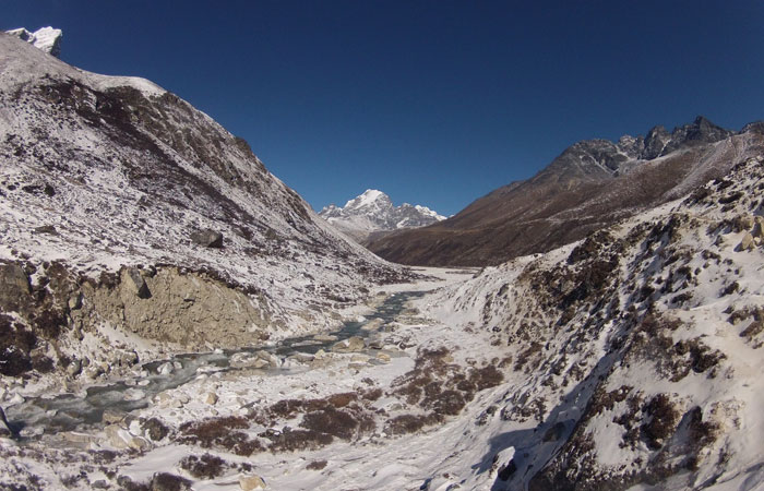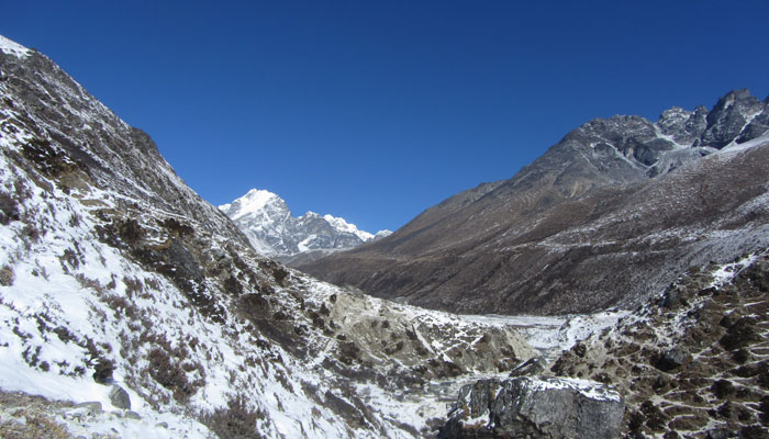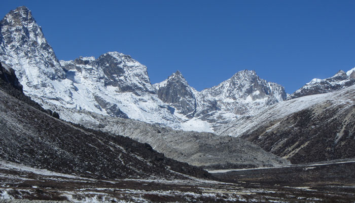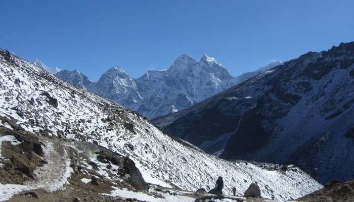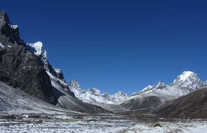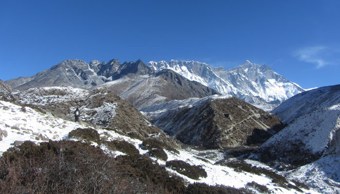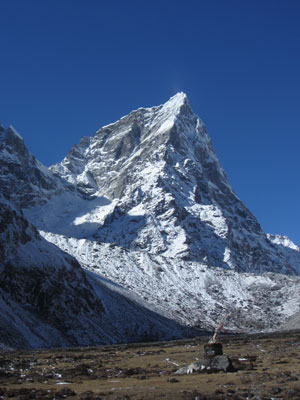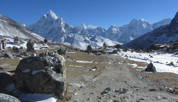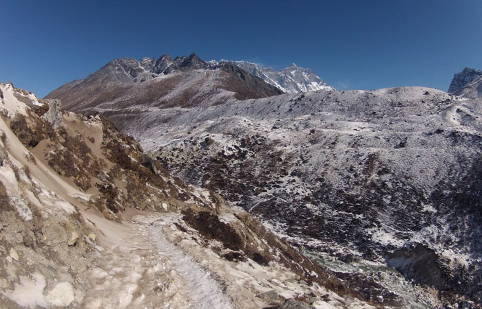 で、ランチ後、ペリチェの広い河原が広がる絶景の谷間みたいなところを通った後、トゥクラからの急に勾配が激しくなる峠越えがめっちゃキツかった。ただ、この峠の上から眺めた風景がこれまた絶景で。いやぁ、素晴らしいですよ、エベレストトレッキング。ゴーキョピークへの道よりも、このベースキャンプへの道の方がオイラ的には好みかも。まぁ、山が雪化粧されたから余計に景色が綺麗に見えるってのが、大きいんだけどね。