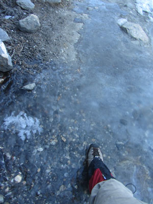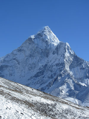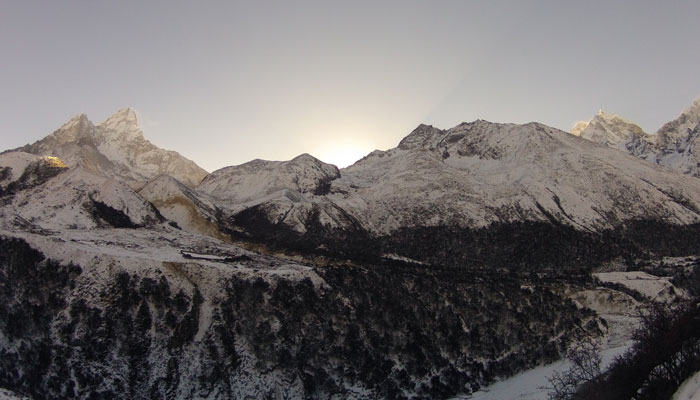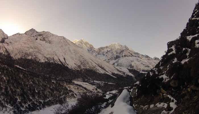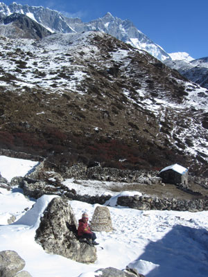 さて、急ぎ足で歩いてはいるものの、真っ白に雪化粧した山風景は、とにかく絶景。大雪に降られてしまった時は、なんて運がないんだって嘆いたんだけど、結果的には雪が降ってくれてよかった。だって、風景をこんなに素晴らしいものに変えてくれたのだから。日程が詰まっているトレッキングだと、雪で足止め食らったりしたら、ただ焦るだけだったんだろうけど、幸いオイラは相当余裕のある日程で予定立ててましたから。一日や二日足止めくらったり、回り道しなくちゃいけないくらいは、なんの問題もない。