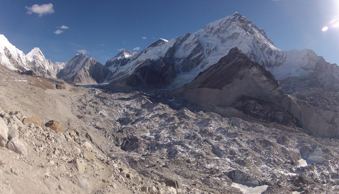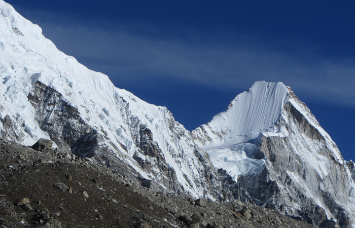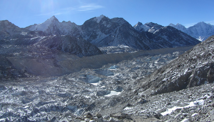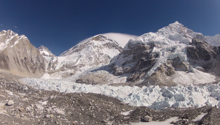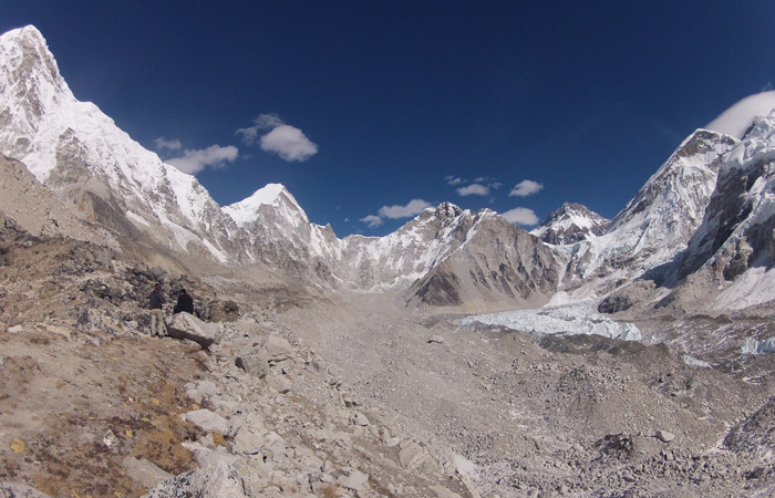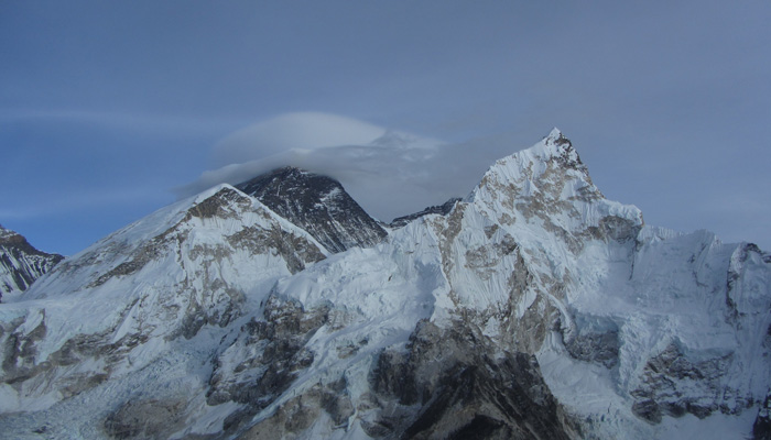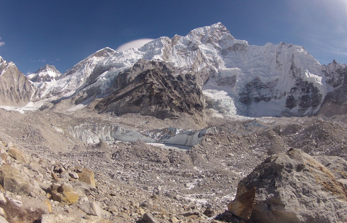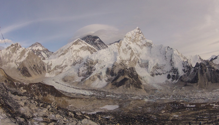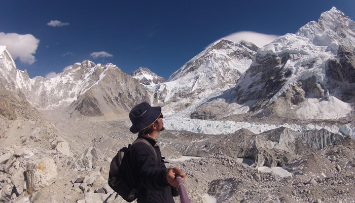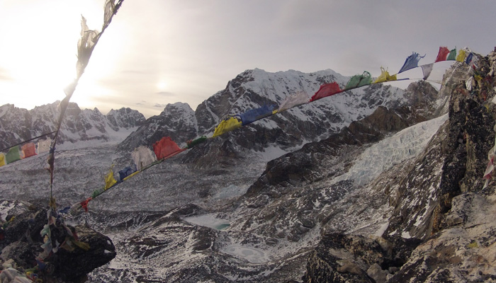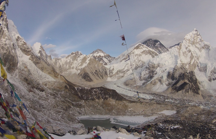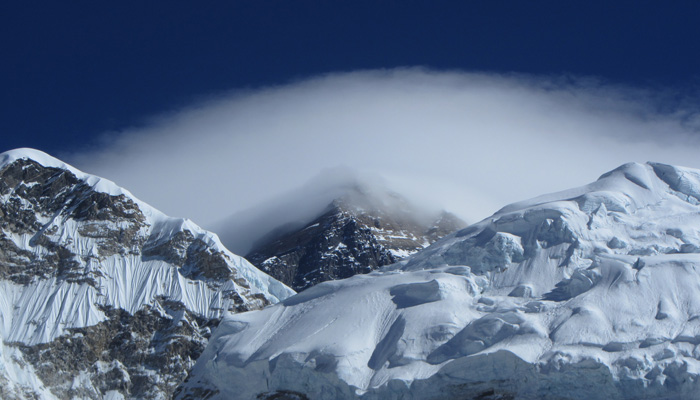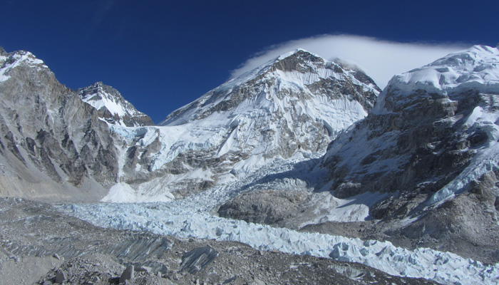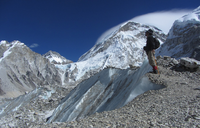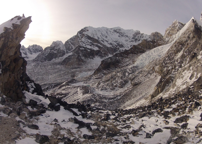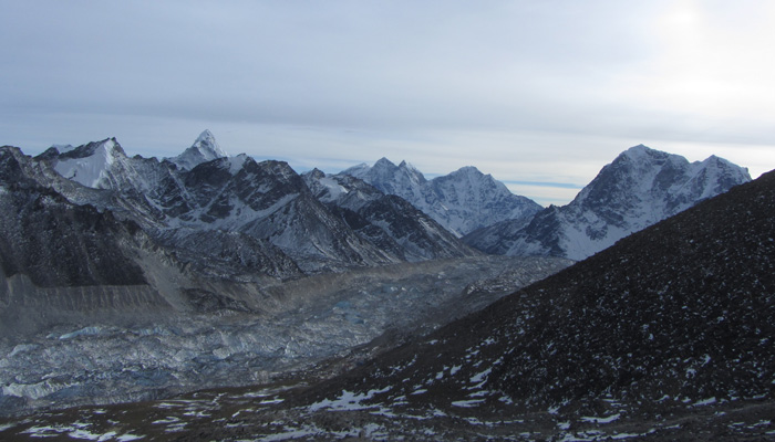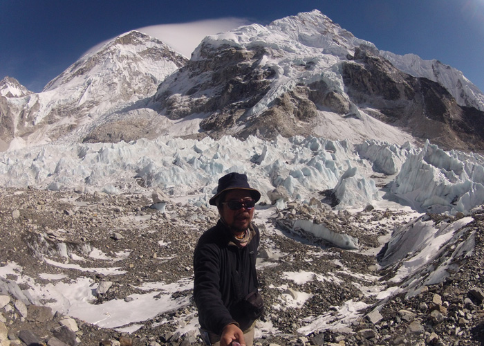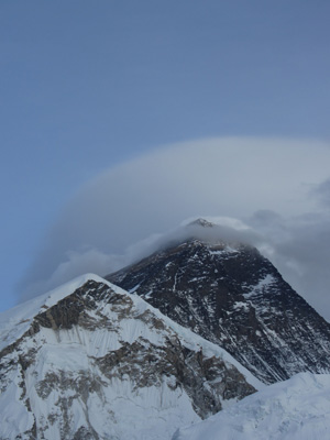 で、ここからの眺めが・・・最高に素晴らしかった。ココからの風景は、世界一の風景かも、と思わず思ってしまった。山頂に傘のような雲はかかっていたものの、エベレストがクッキリ見える。そして、その周囲を囲む白く雪化粧した山々、そして谷間を走る氷河、それらが眼下に見えるのだ。