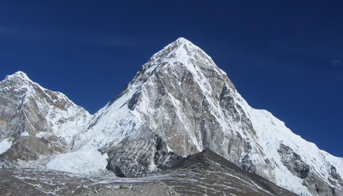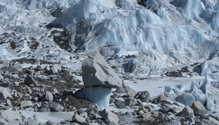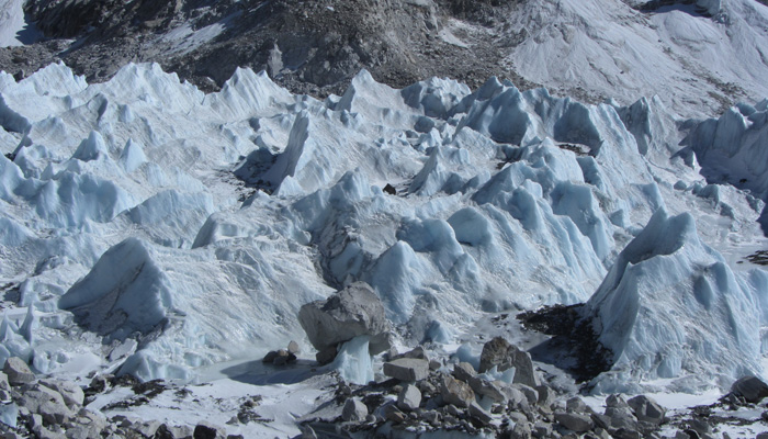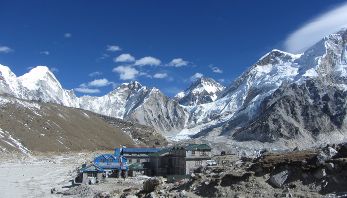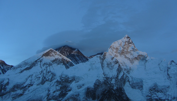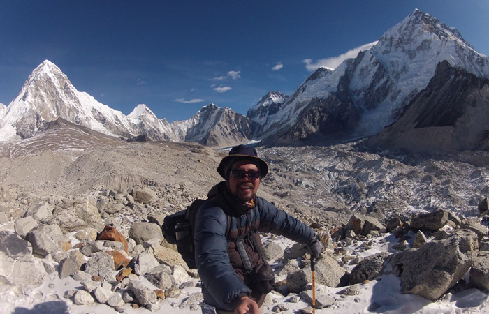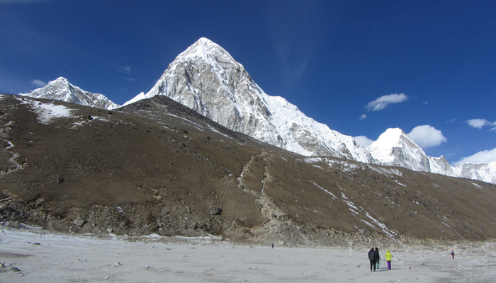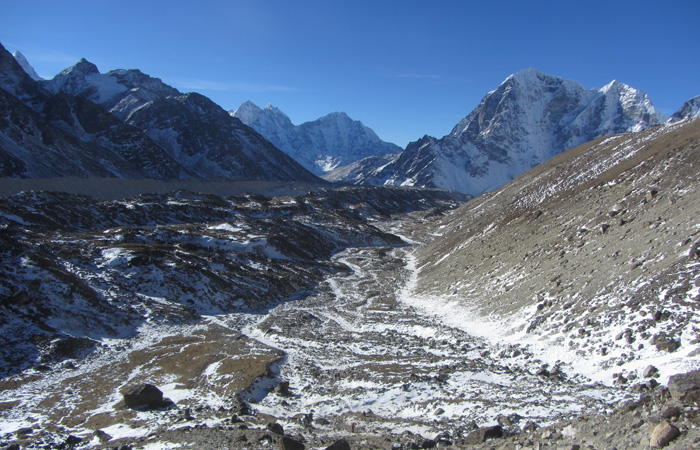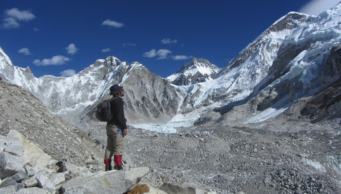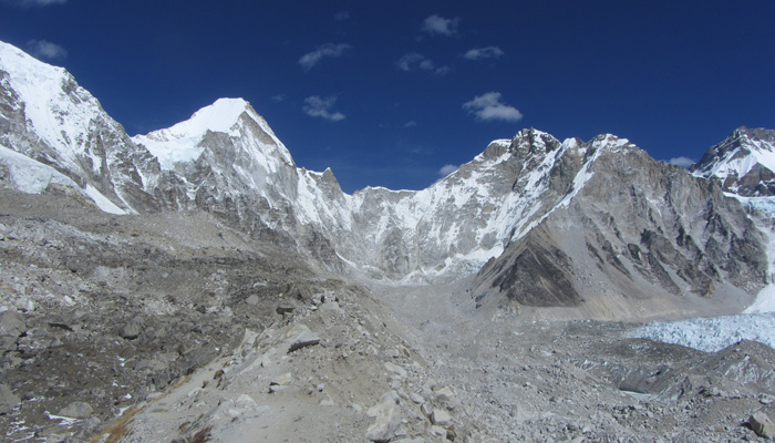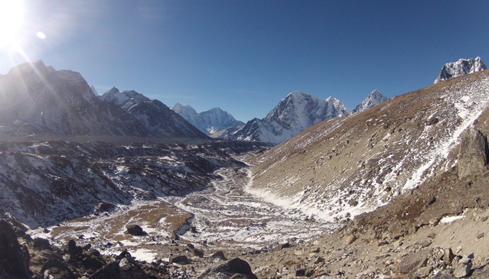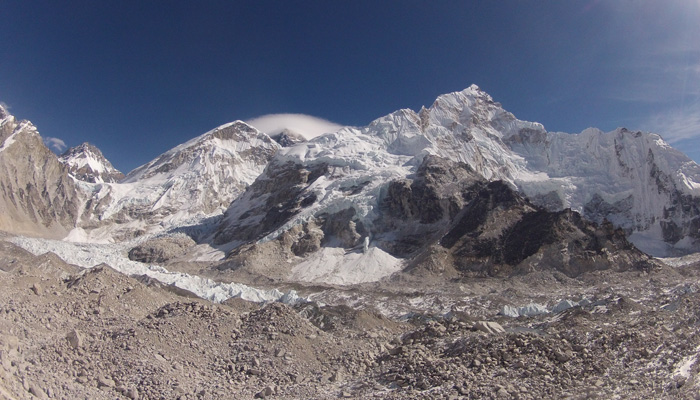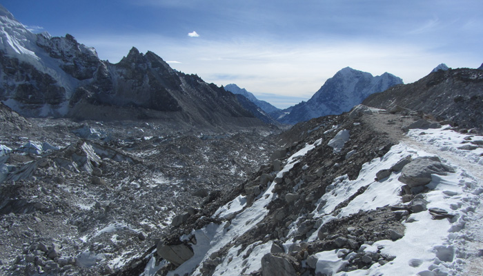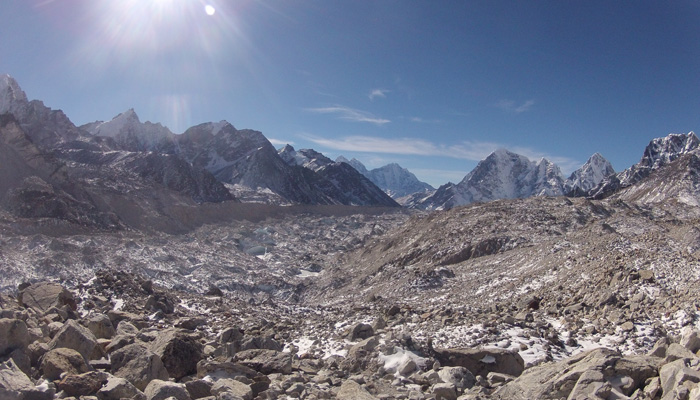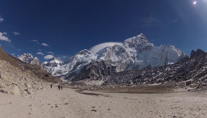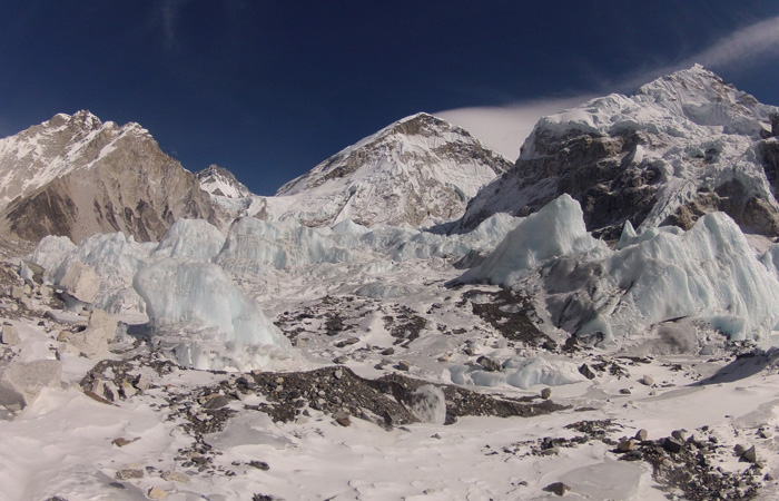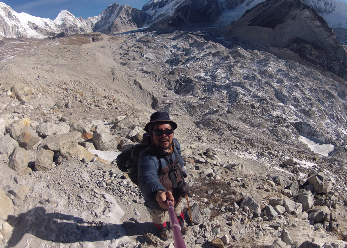 で、ここからの眺めが・・・最高に素晴らしかった。ココからの風景は、世界一の風景かも、と思わず思ってしまった。山頂に傘のような雲はかかっていたものの、エベレストがクッキリ見える。そして、その周囲を囲む白く雪化粧した山々、そして谷間を走る氷河、それらが眼下に見えるのだ。