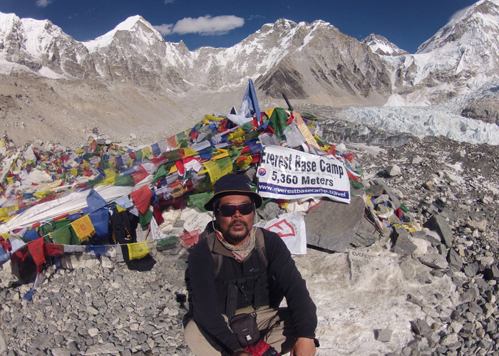 う~ん、残念。しかし、せっかく来たのだから、ベースキャンプには行っておかねばと、ゴラクシェフで宿にチェックインして、荷物を置いた後、軽装スタイルで、ベースキャンプまで歩いていくことに。1時間くらい歩いて5,360mのベースキャンプに到着。白い雲に隠れているもののエベレストの山頂が眼前に見える。ここから見ると、すぐそこに見える。8000mなんて絶対無理って思っていたのに・・・ベースキャンプからエベレストを見ちゃうと、ひょっとしてエベレストの山頂に登れちゃうんじゃないの?なんて錯覚に陥っちゃう。