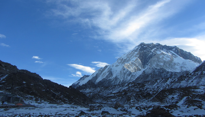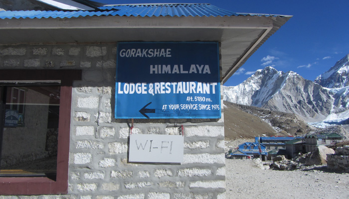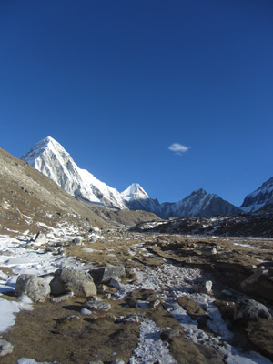 昼前にはゴラクシェフに到着することができた。しかし、よくよく見ると、エベレストがあるらしきところには、雲がかぶっちゃってきているる。他は晴天で空は青々としているのに、エベレストの部分だけ帽子をかぶっているかのように、白い雲で覆われちゃっているのだ。