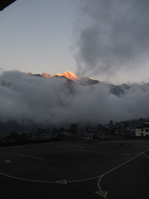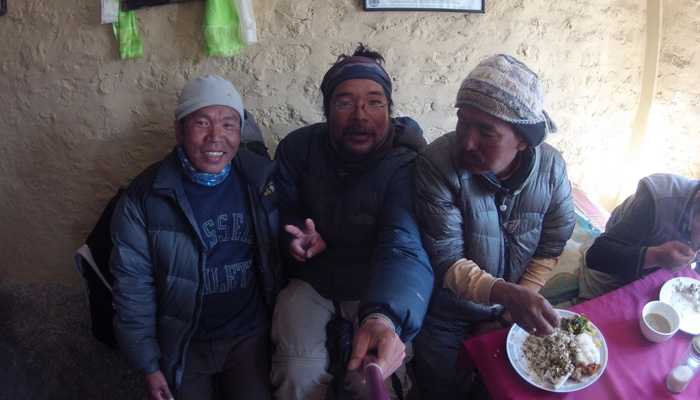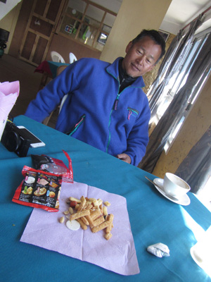 さて、宿に戻って来たら、一人の日本人の人がチェックインしていた。ちょうどトレッキングを終え、明日の飛行機で飛ぶという日本の某会社の会社員荻野さん。で、荻野さんと一緒に居たガイドさんが・・・なんと、ラマさんで、しかもポーターがホズラさんじゃないですか。これにはビックリ。